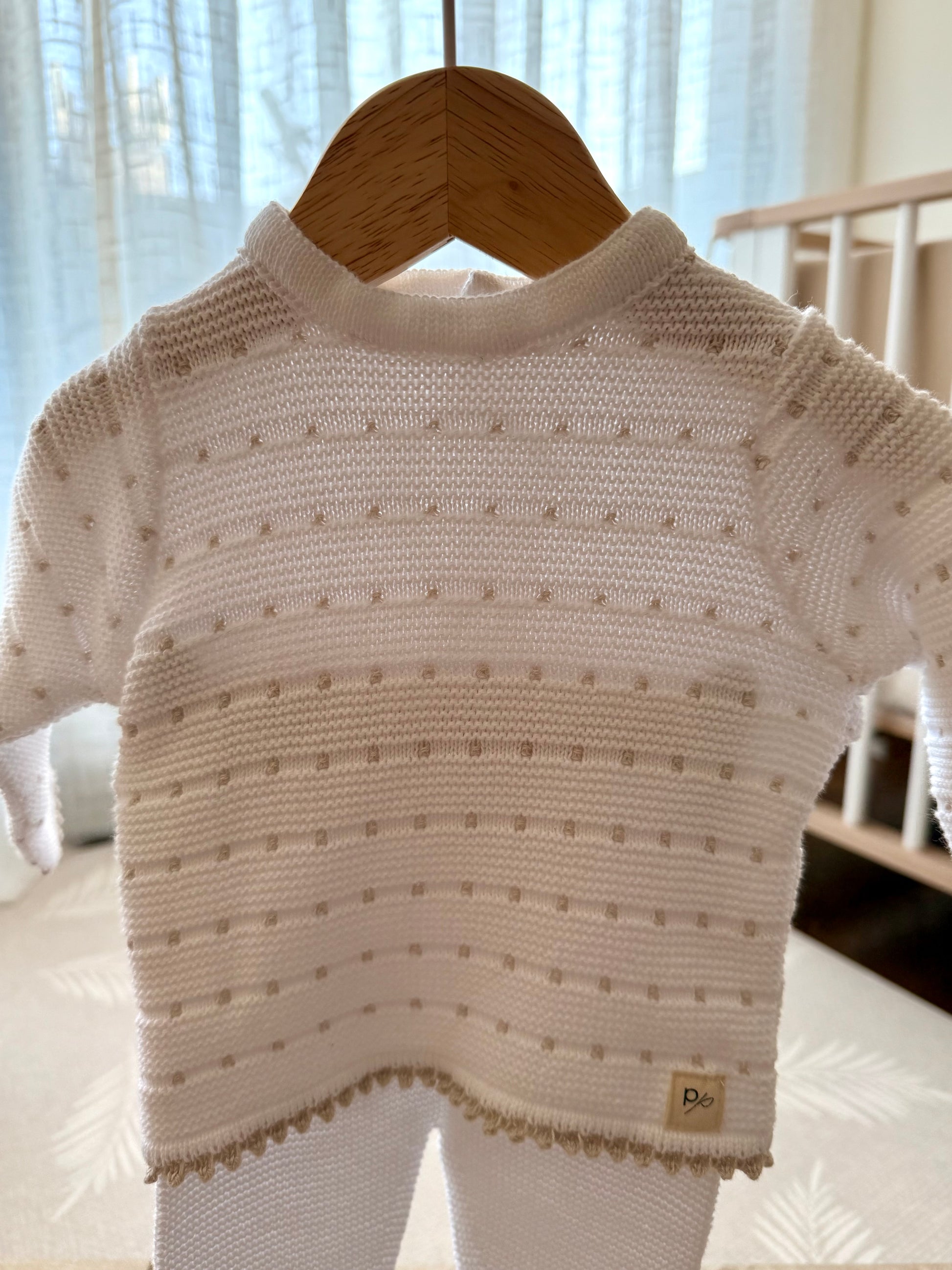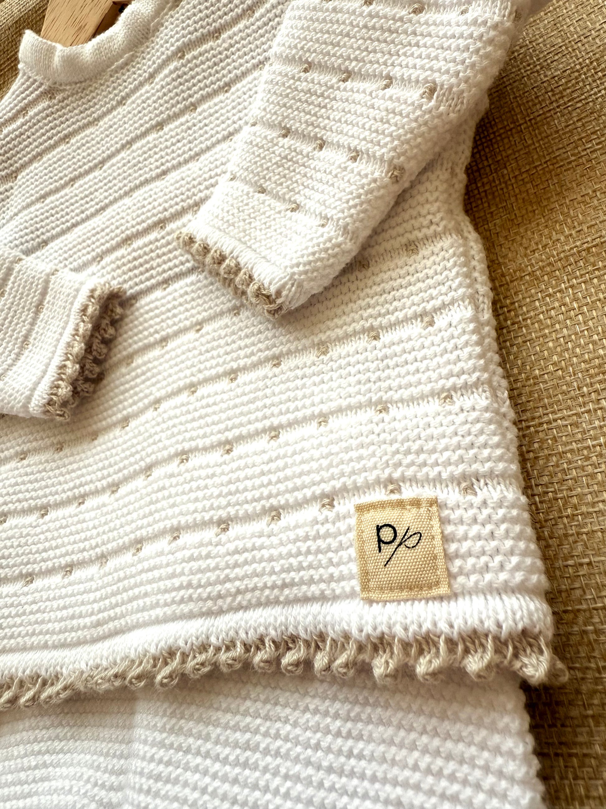Cuando la elegancia esta en lo simple. Suave y delicado tejido de tres piezas 100% algodón, de un tono blanco cálido con detalles en beige.