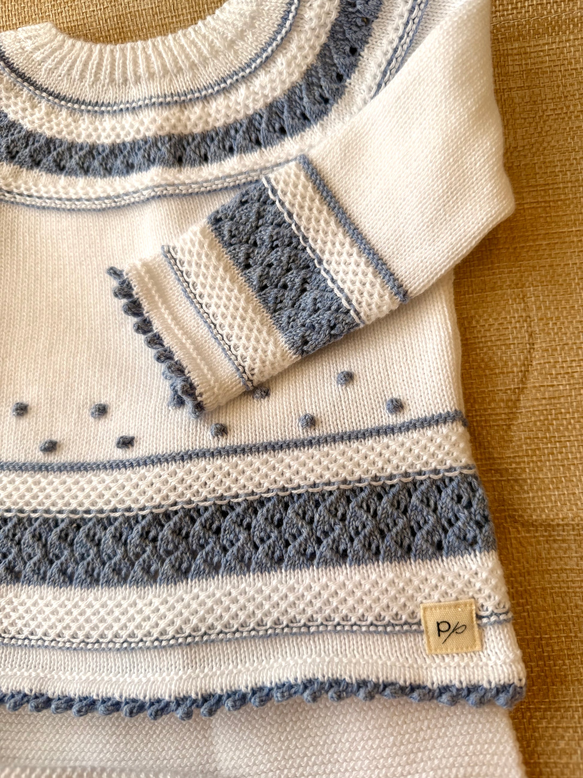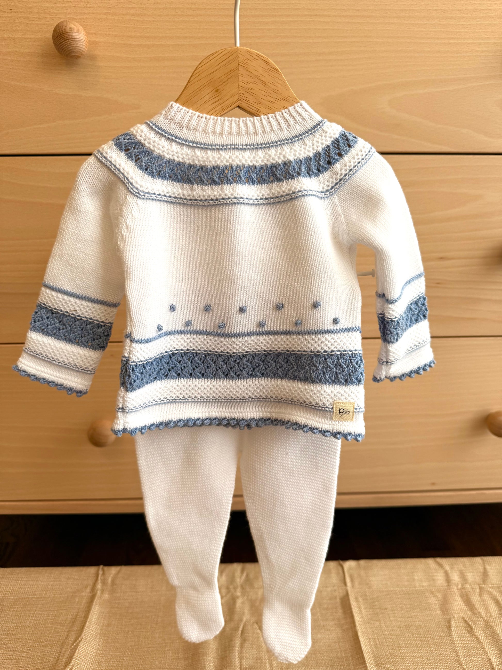 Conjunto blanco de tres piezas con detalles azules en punto calado y pequeños bordados. Diseño atemporal ideal para cualquier momento. 100% algodón, hecho en España.