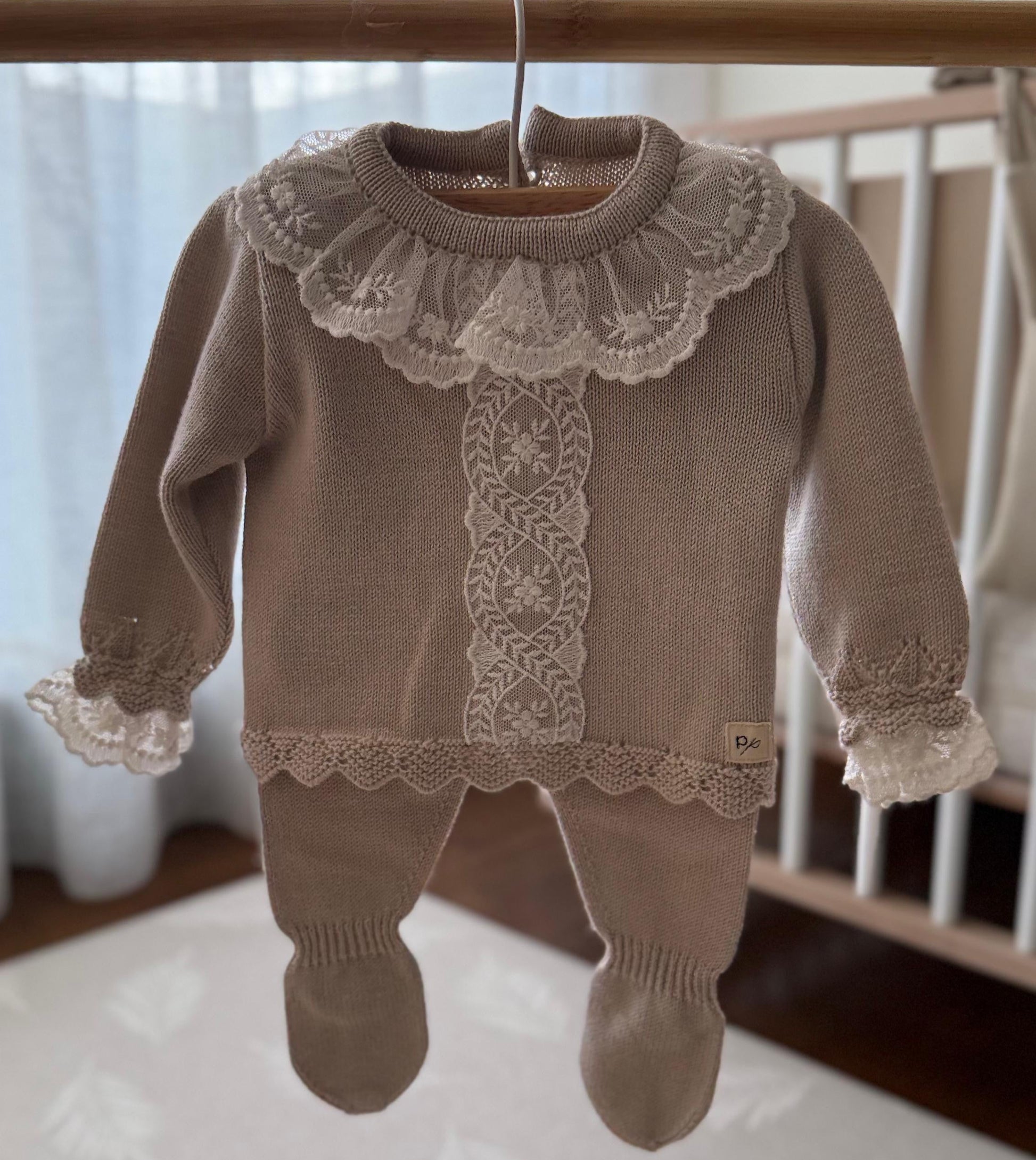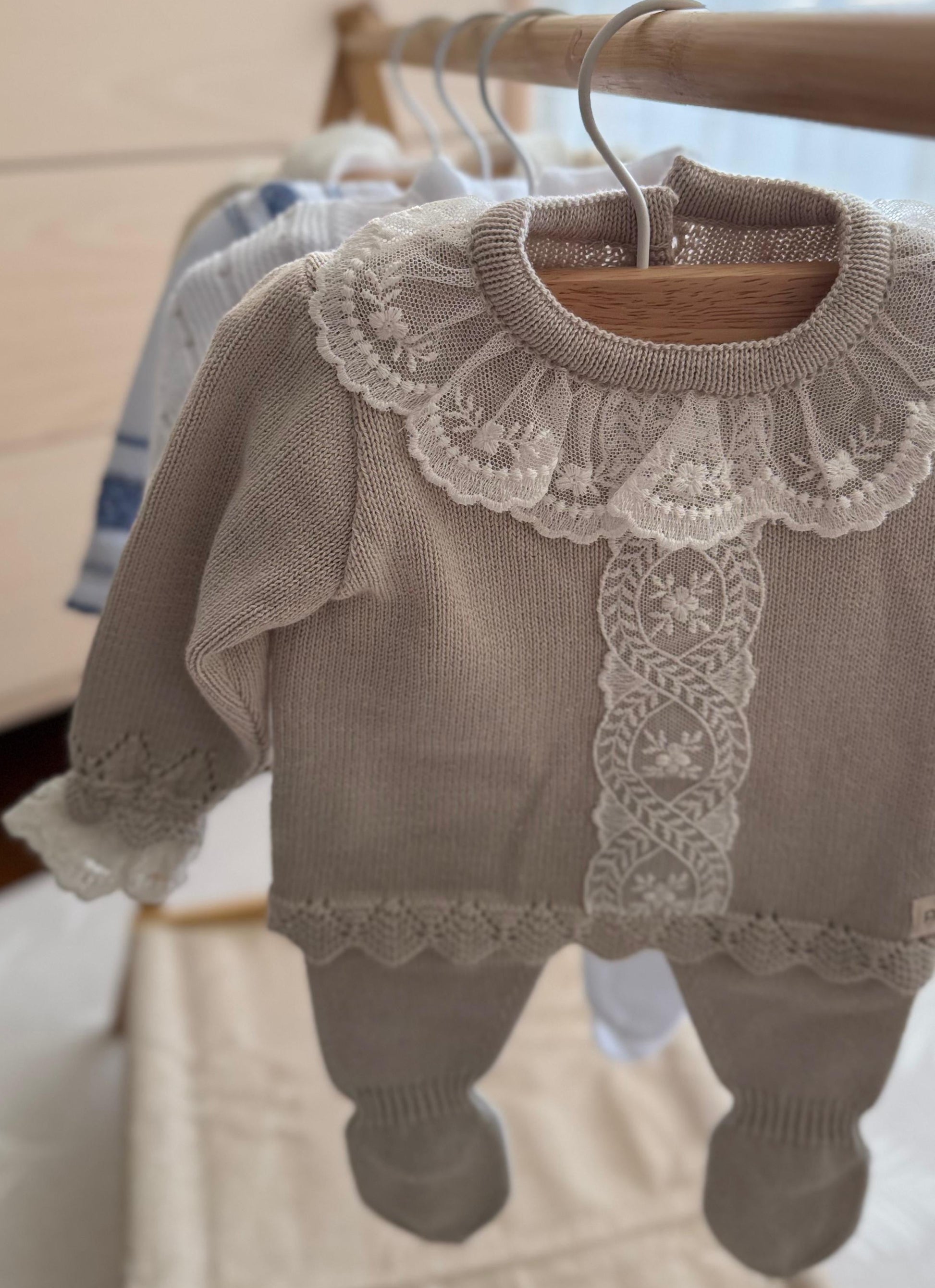 Diseño artesanal en tono piedra con delicado encaje blanco y capota a juego. Un conjunto que destaca por su textura, suavidad y elegancia. Hecho en España, tejido en algodón.