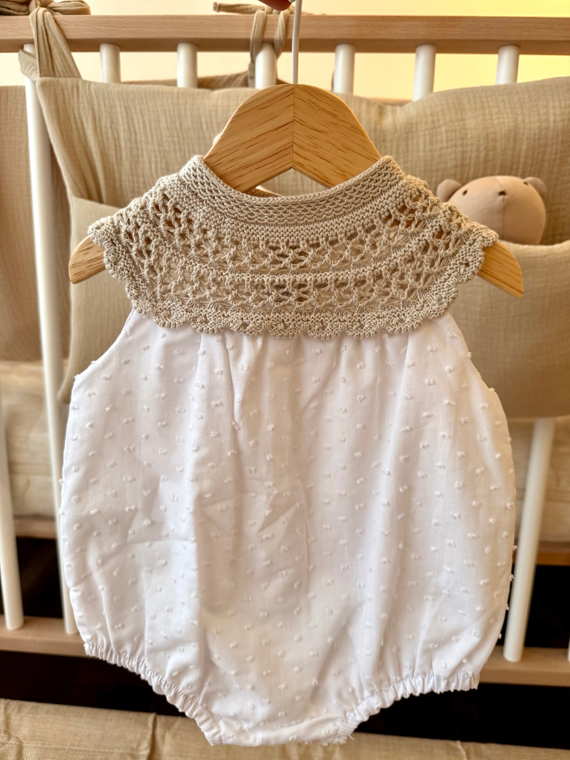 Una ranita que transmite total delicadeza. Confeccionada en algodón y con un cuello tejido que realza su estilo. Cómoda, fresca y con un diseño atemporal que acompaña con suavidad y elegancia.