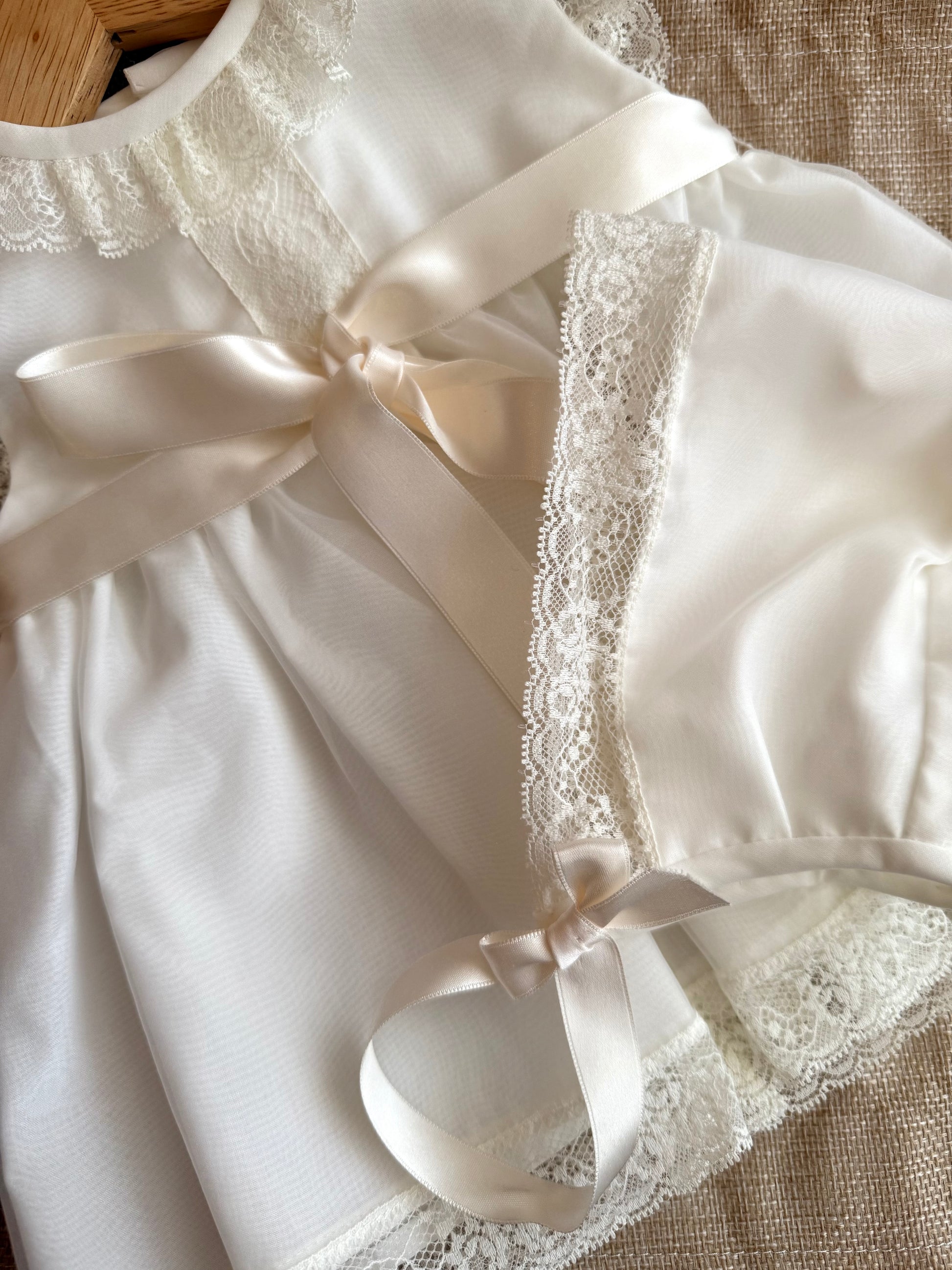 Vestido de ceremonia, con delicados detalles en encaje y un lazo de raso que lo hacen ideal para esas ocasiones que merecen distinción. Capota y braguita a juego.
