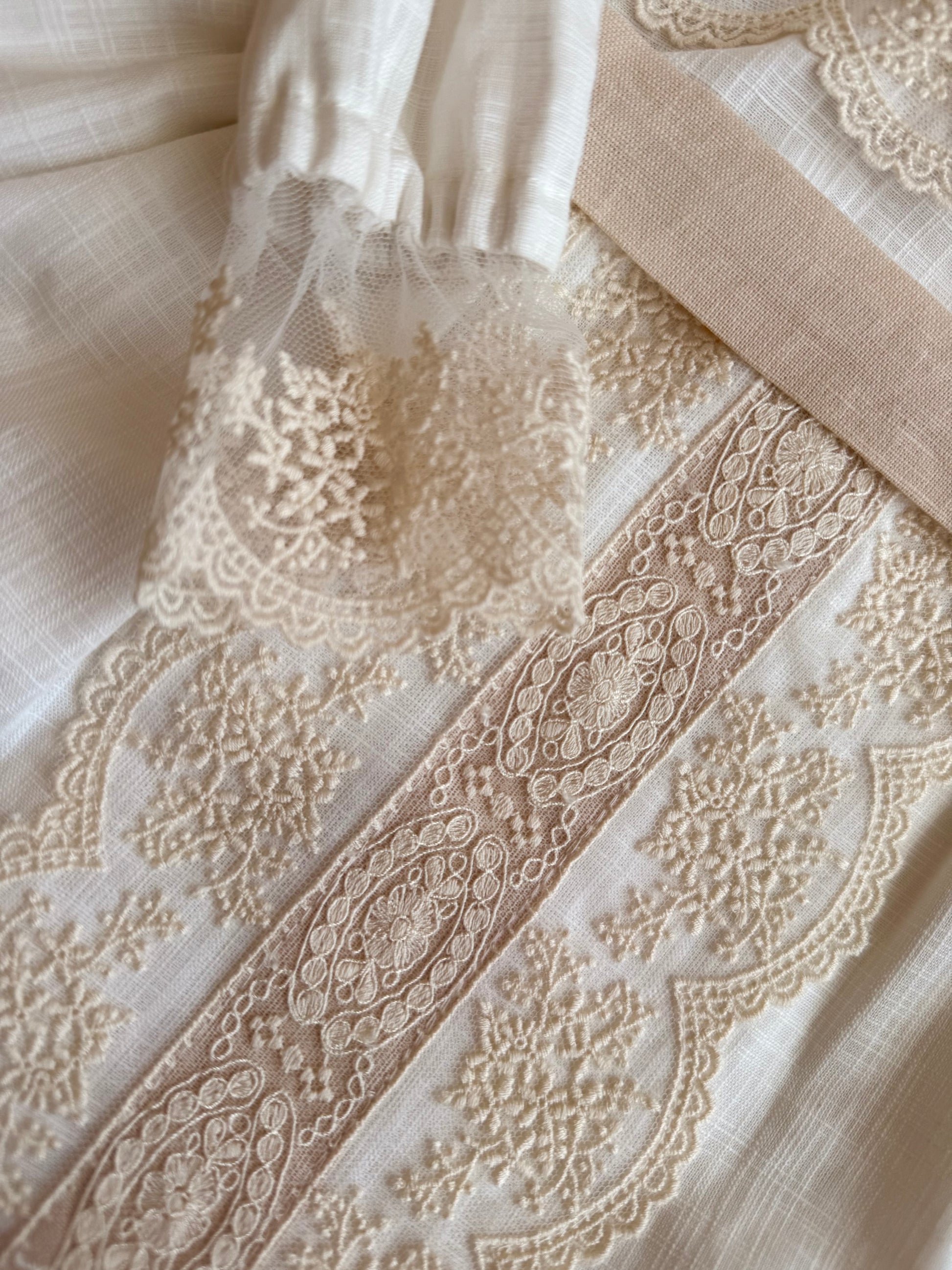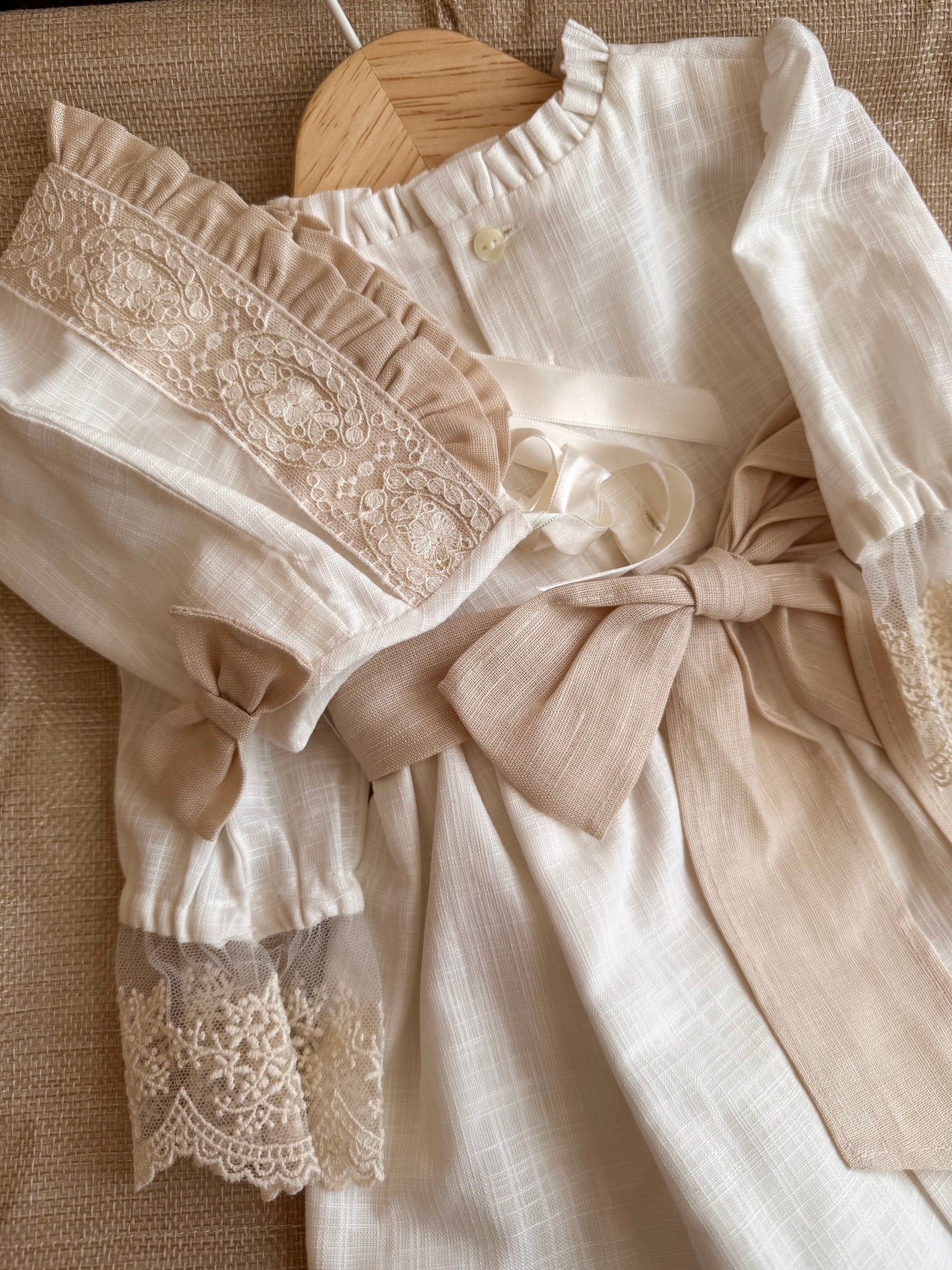 Vestido confeccionado en lino y algodón con bordados delicados y fajín en tono natural. Incluye capota y braguita a juego. Su diseño clásico transmite la elegancia atemporal de la costura española. Ideal para sus primeros momentos importantes. Hecho en España.