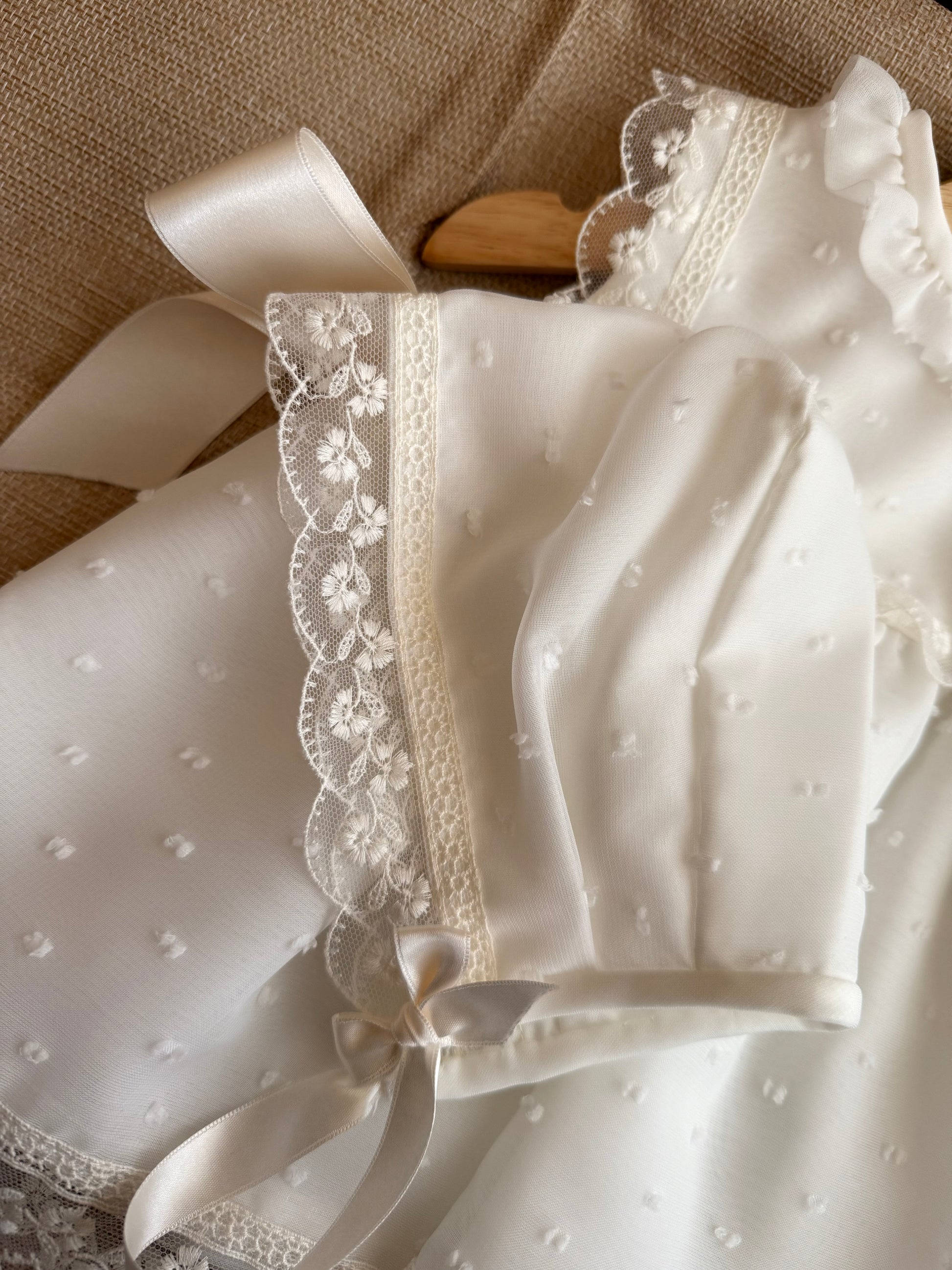 Vestido de plumeti con detalles de encaje, sutiles volantes y un lacito de razo en la espalda. Con capota y braguita a juego. Ligero, elegante y con distinción española. Ideal para ceremonias especiales o celebraciones familiares.